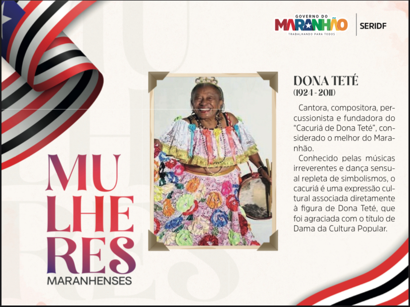 Na cultura popular, o destaque vai para Dona Teté (1924–2011), criadora do tradicional Cacuriá de Dona Teté; Patativa (1937–2025), ícone do samba maranhense; e DJ Nega Glícia (1977–2024), pioneira do reggae feminino no Estado.
